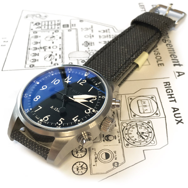 The A-13A comes from passion, fascination and romance. A lifelong passion for flight, the fascination of precision mechanics an the romance of the era of piston-engined aircraft. It also comes from the realisation that, to this day, there simply isn’t a more effective way of reading the time quickly, accurately and from a distance than the A-13A military specification dial. The need behind the design is simple: allow a pilot to tell the time at a glance while flying an aircraft in combat. Through research, study, trial and error, this is the result. As good today as when it was created.
